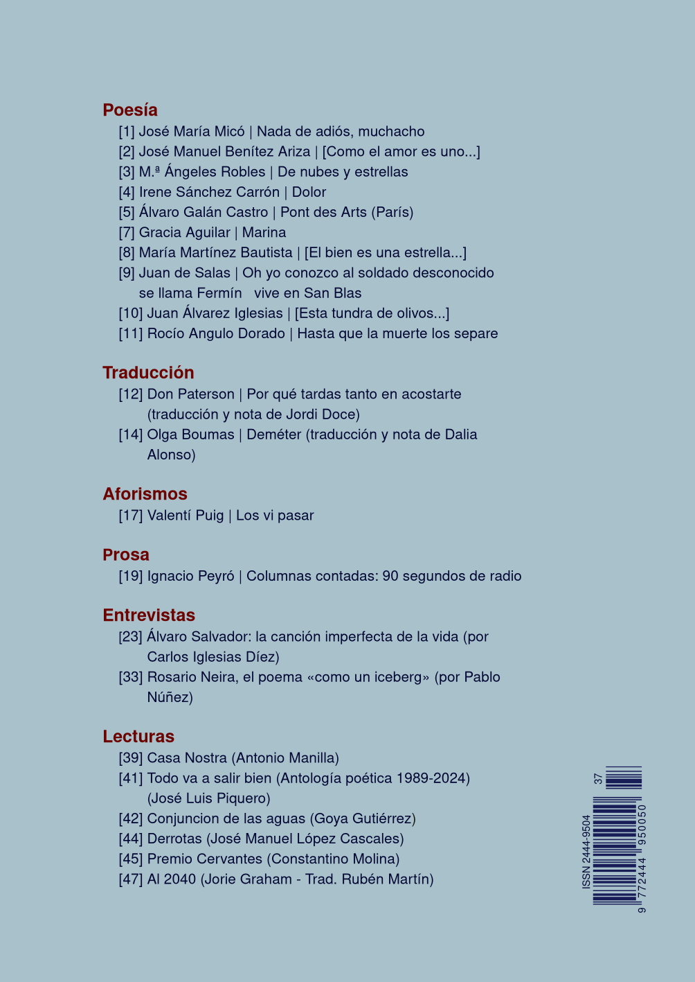 Número 37 de la revista Anáfora, marzo de 2026. Poemas, traducciones, prosas, entrevistas y reseñas. Consulta el índice en las imágenes. Si quieres recibir las revistas en tu casa según se publican, tienes la opción de suscribirte.